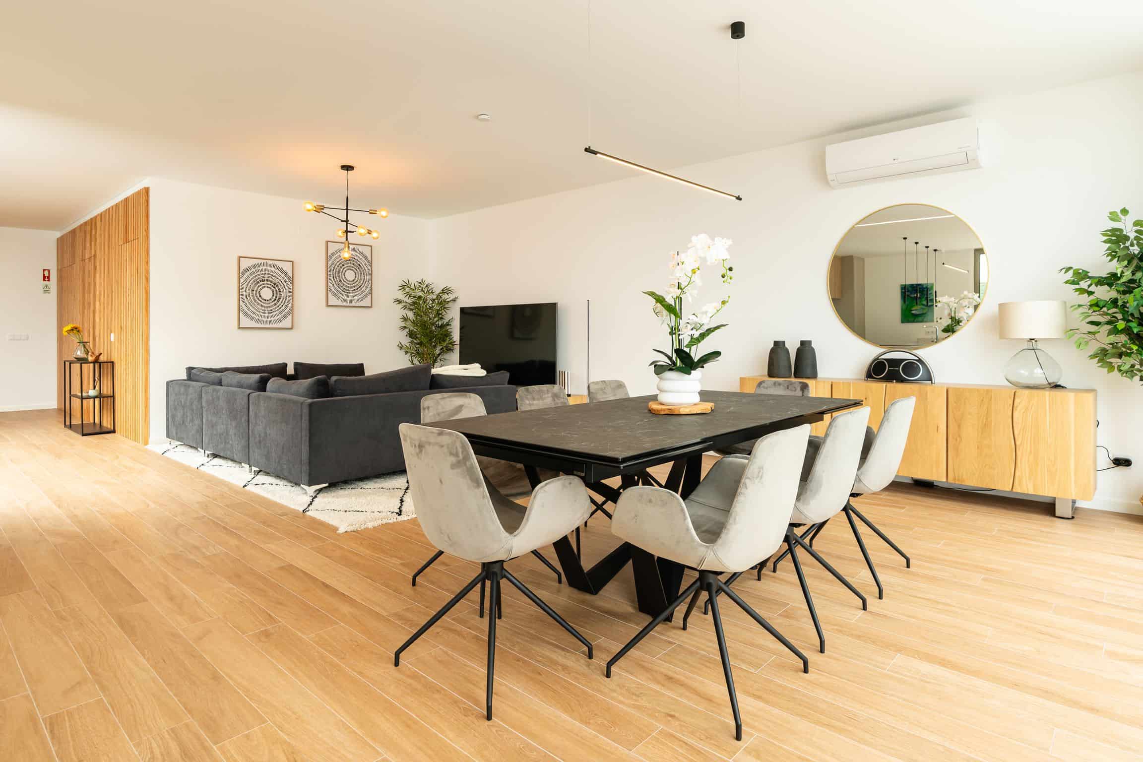 An open-plan living and dining area that flows to the terrace — light, comfortable, and made for shared mornings and long evenings.